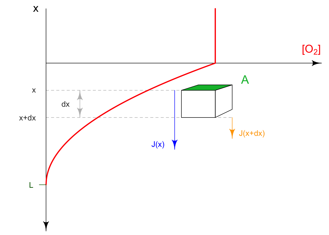 where \(\frac{dc}{dx}\) is the \(O_2\) concentration (\(c\)) concentration gradient with respect to \(x\), and \(D\) is the diffusivity coefficient. The sign of this equation does not change regardless of the direction of \(x\). Indeed, for a positive \(dx\), the oxygen concentration increases, so \(dc>0\). As a result, \(\frac{dc}{dx}>0\). As result, \(-D\frac{dc}{dx}<0\), i.e., \(J(x)<0\), which is correct using this direction for the axis. The derivative of the flux can thus be written as:
