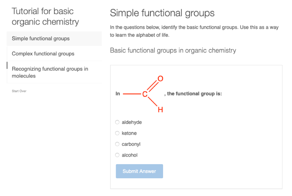 - Use the JSME molecule editor to draw simple functionalized molecules given a name, and given a SMILES code
