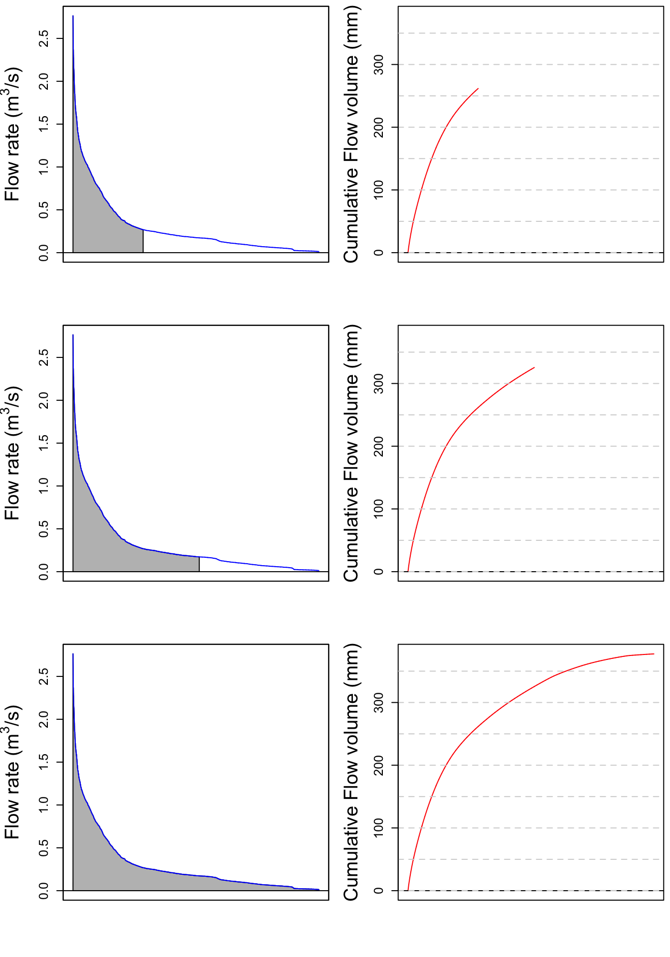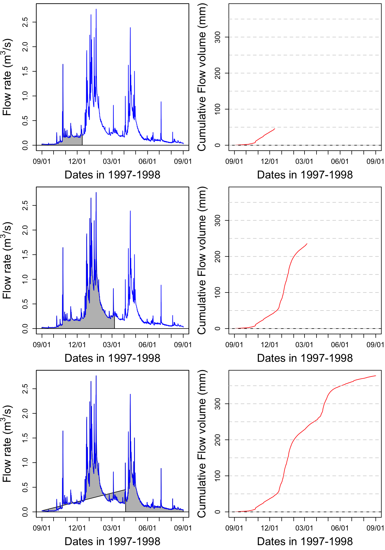 Let us apply this method to the Maudouve hydrograph plotted earlier. Calculating the cumulative flow corresponds to integrating under the hydrograph curve, as represented by the grey area on the left panel. The corresponding cumulative flow, expressed in mm is plotted on the right side of the plots.