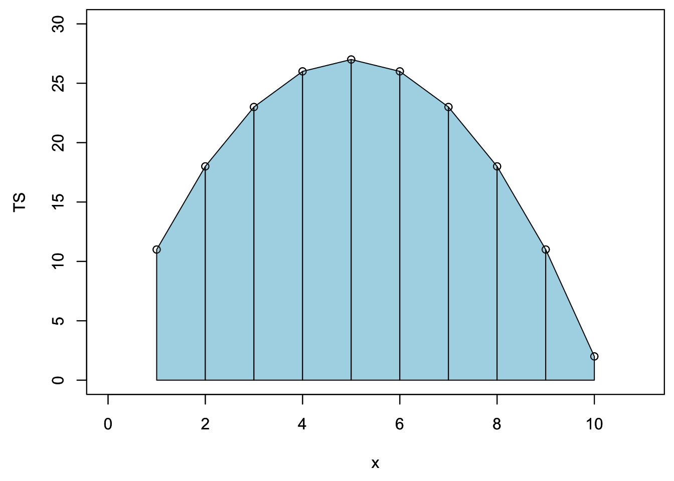 TS<-25-(x-5)^2+2;xlim=c(0,11);ylim=c(0,30)