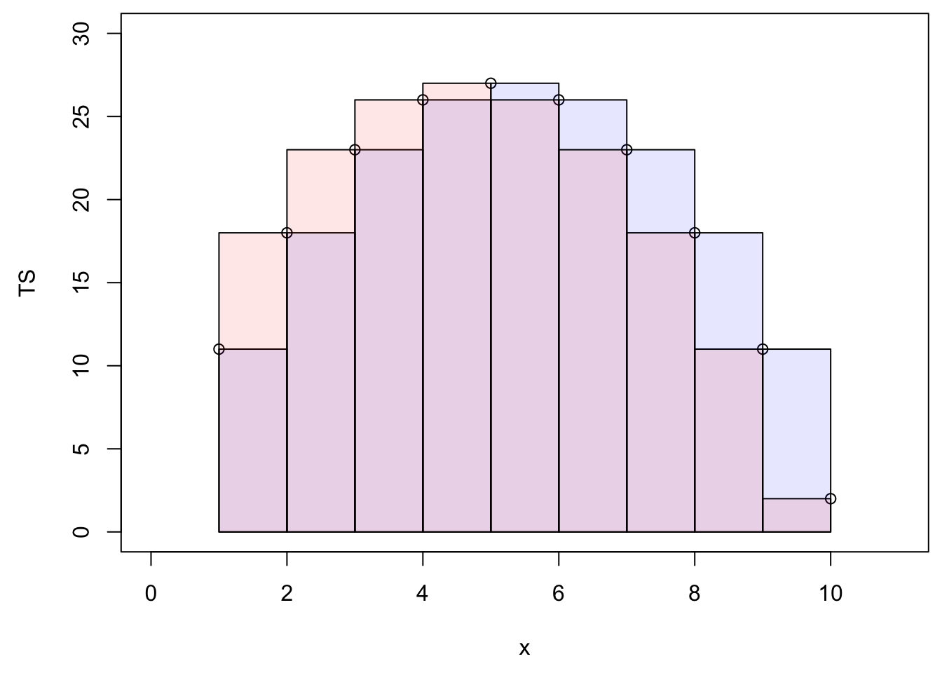 for (i in 1:9){QQ=(TS[i]+TS[i+1])/2;cumTS_inst[i+1]=cumTS_inst[i]+QQ}