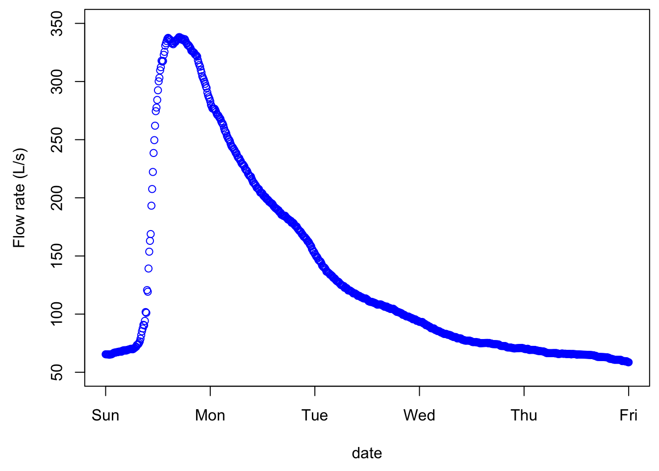 plot(date,Q,xlab = "date",ylab = "Flow rate (L/s)",type = "p",col="blue",xlim=xlimHG,ylim=ylimHG) # this plots the hydrograph