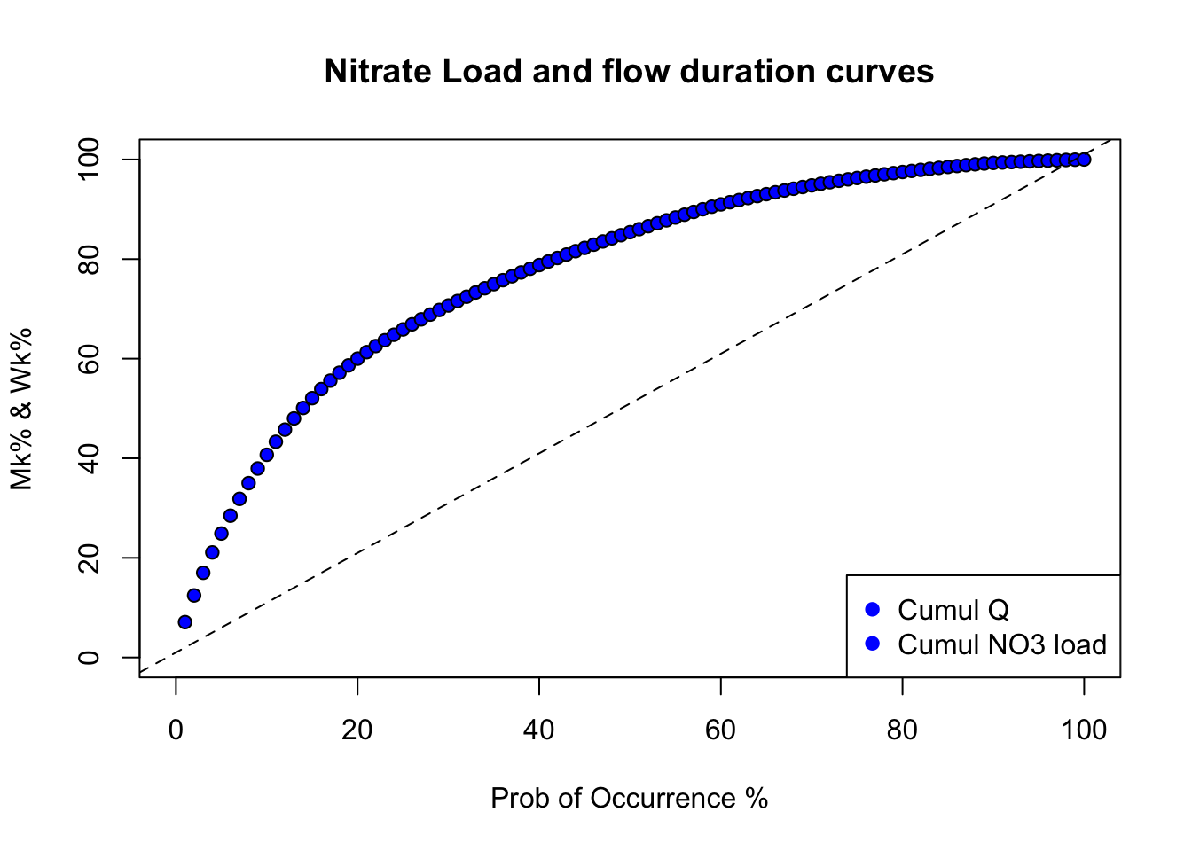 legend("bottomright",c("Cumul Q","Cumul NO3 load"),