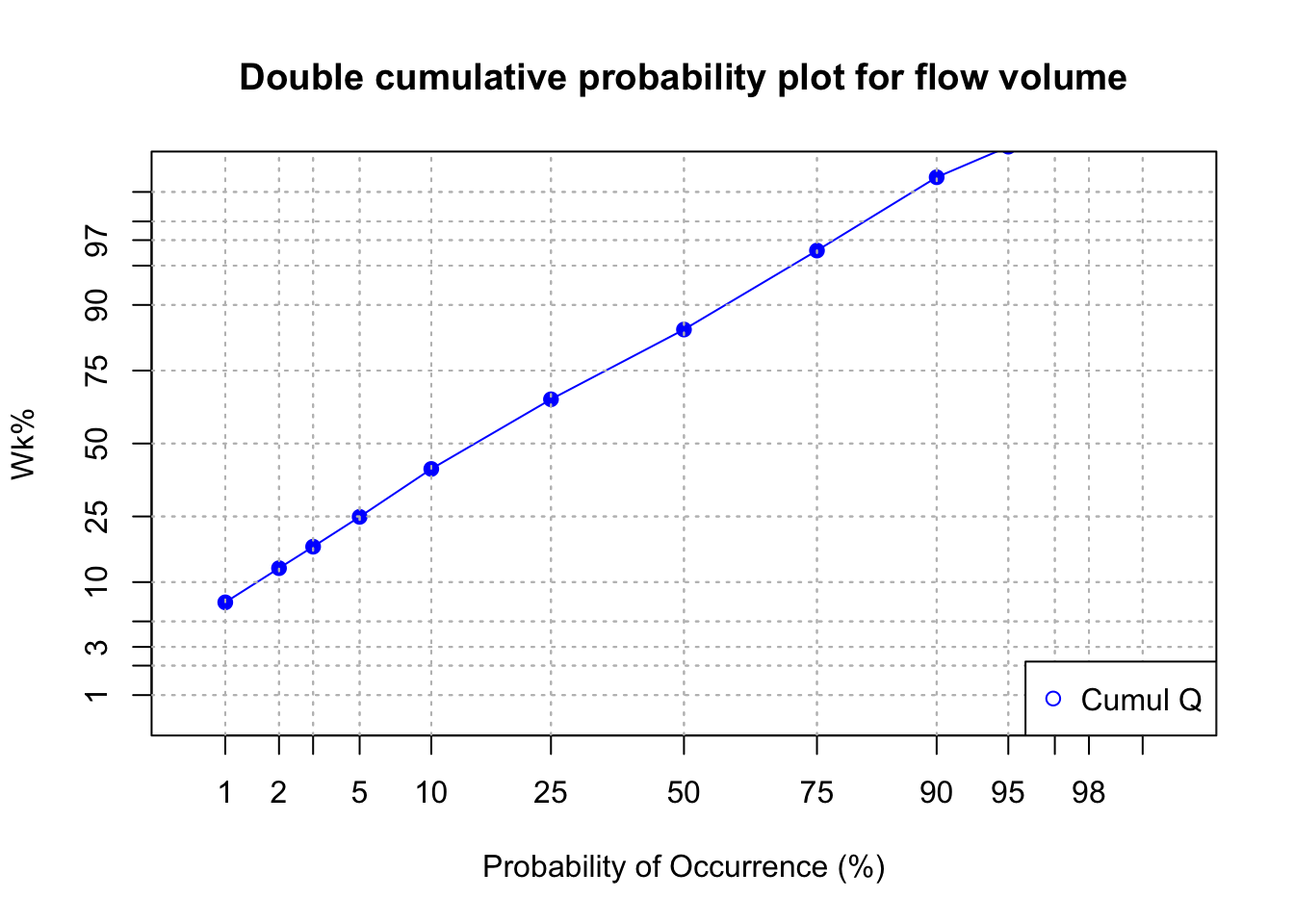 title(main="Double cumulative probability plot for flow volume") # the \n in the text allows for line break in the title