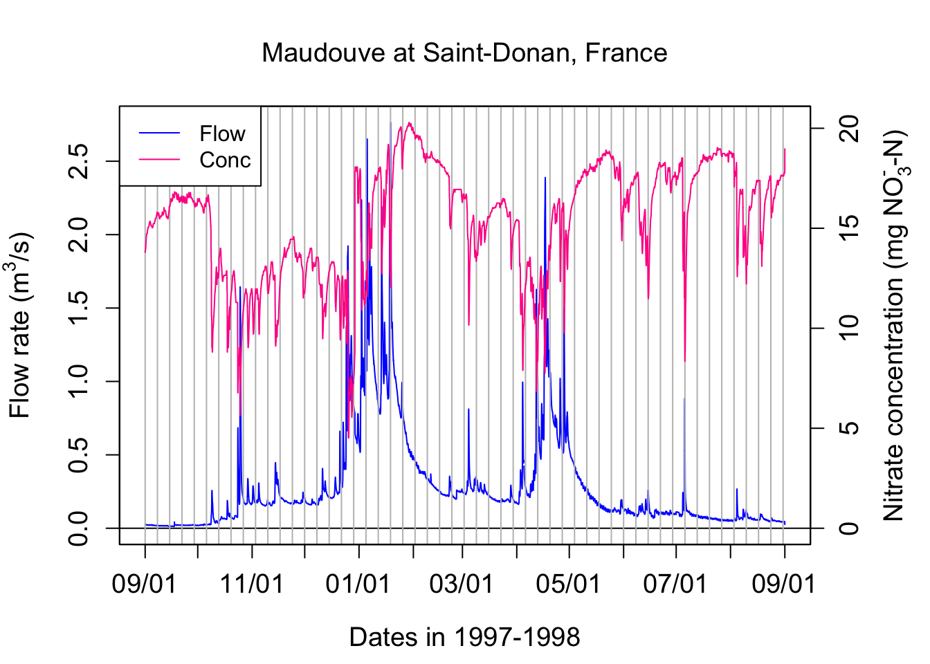 One can see that the concentration of nitrate in this example is not constant! It varies opposite to flow variations, with the concentrations appearing relatively all the more diluted that flow is high. This is referred to as a dilution effect.