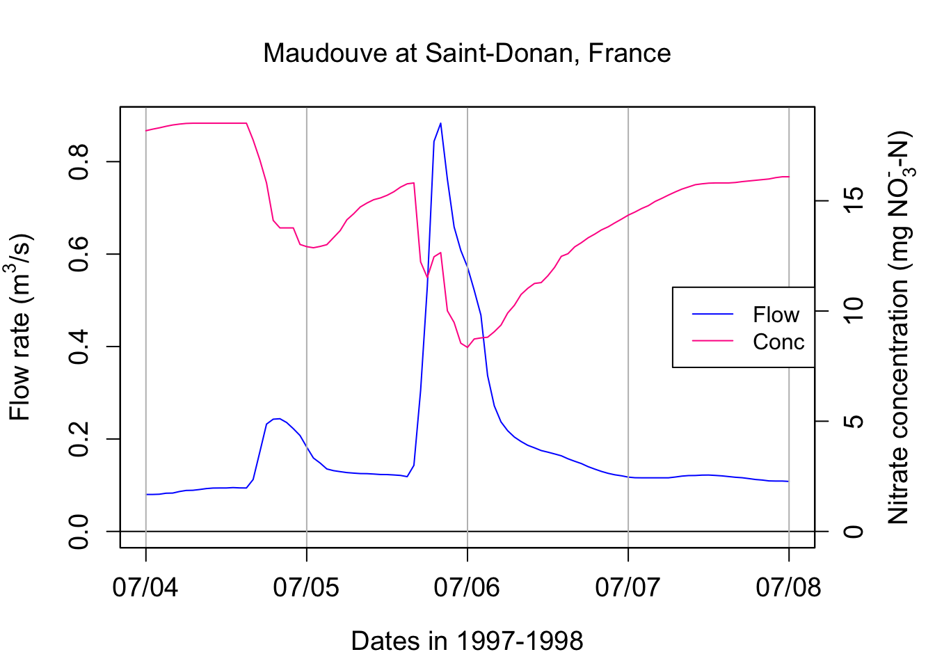 names(hydgph)=c("date","Q","NO3")